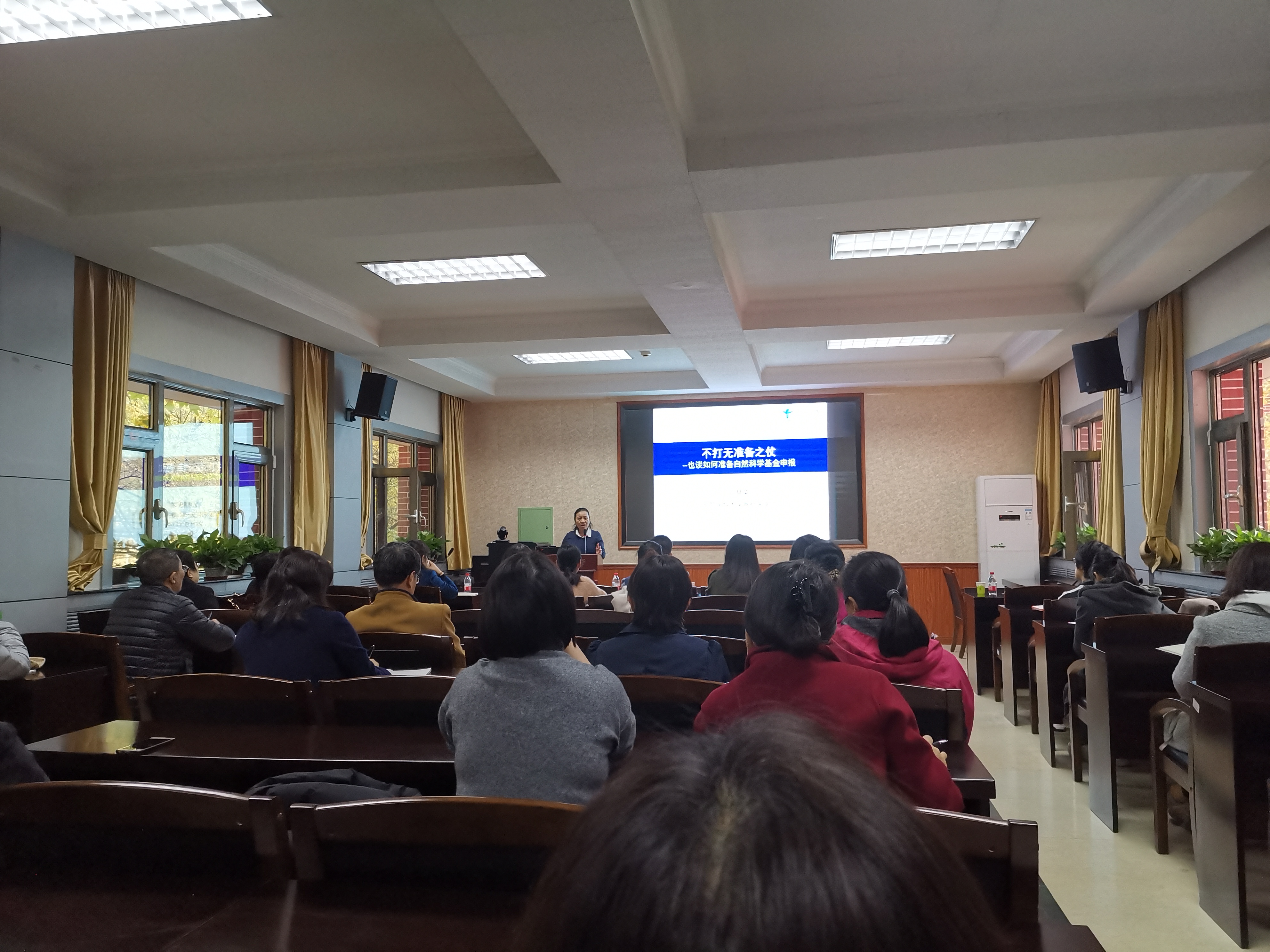 刘慧荣教授从自然科学基金申报前的准备工作、基金申报标书的撰写流程及注意事项、基金申报过程中应该规避的细节问题等几个方面展开讲座。期间,刘教授还穿插自身做科研的生动案例,生动讲述了科研工作是如何做的;勉励各位老师从日常工作中开展科学研究;根据现有条件和优势,一以贯之的持续一系列的研究。在座的各位老师不仅学到了如何撰写一份令评审专家“赏心悦目”的申报书,还从刘教授身上学到踏实、勤恳、严谨、求实、持之以恒的科研素养,也感受到了刘教授孜孜不倦、无私奉献的个人魅力。她的科研情怀和学术精神深深的感染着在场的每一位老师。最后,刘教授分享了自己是如何撰写标书的经历,提出了创新性、可行性、可读性的九字原则,讲述了撰写过程中应该注意的细节。“细节决定成败,功夫在场外”,是刘教授对所有做科研教师的谆谆教诲。