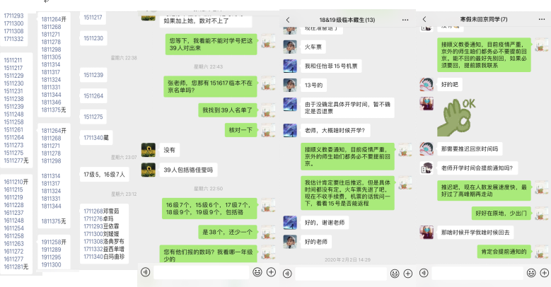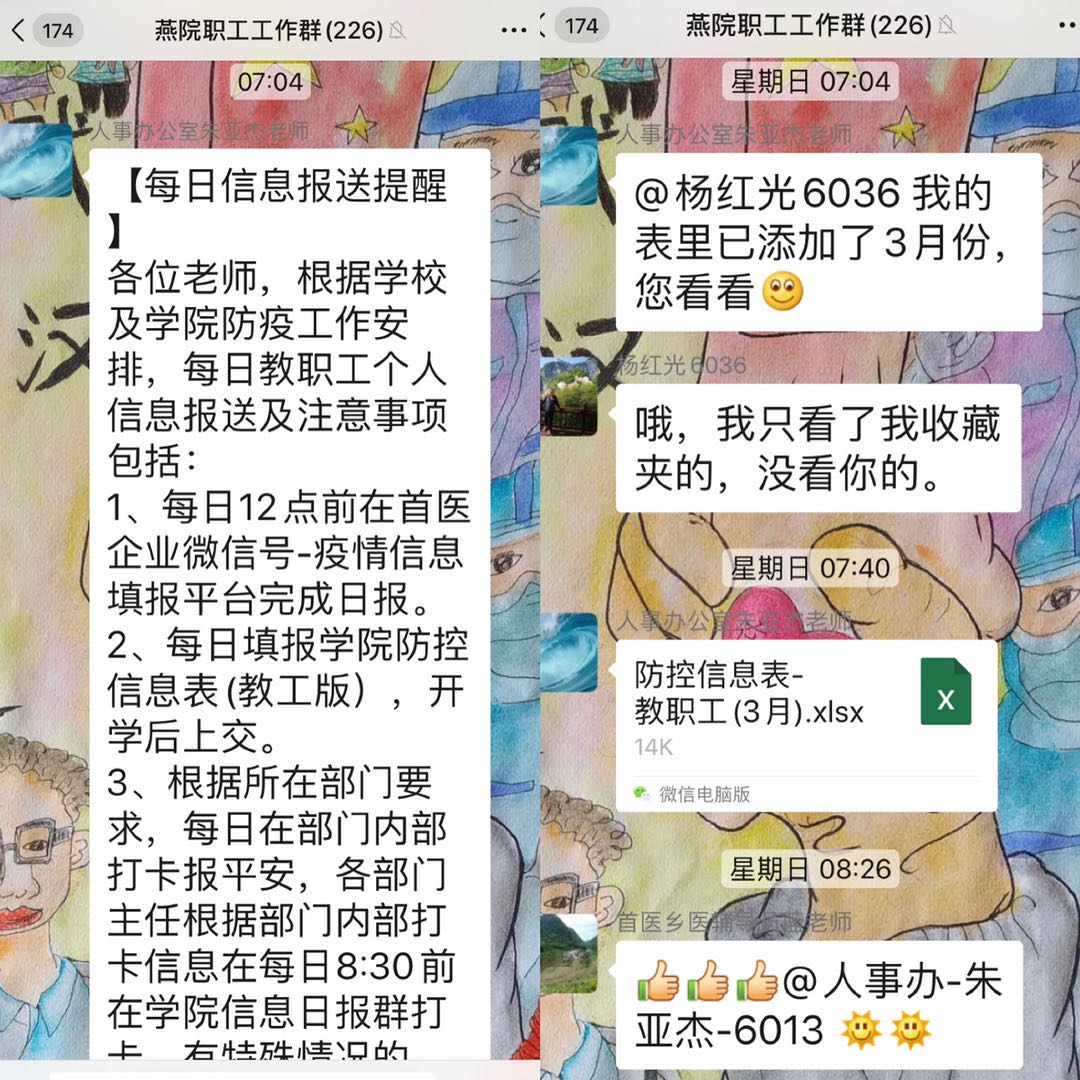 “1月23日,在接到顺义区教委和嗨皮漫画 要求统计学生离京返京情况通知后,各学系党支部书记和所有辅导员老师,大家通过微信、电话一对一联系核实,分工落实,直到凌晨1点多才完成前期台账汇总。2月6日,接到学校6+1表格填写任务,嗨皮漫画 全体辅导员从上午9点开始逐一核对相关学生数据,一直到下午5点才完成核对工作。”学生办公室负责人张艳辉老师回忆初期防控工作时,特别感谢每一位辅导员的热情配合和辛勤付出。