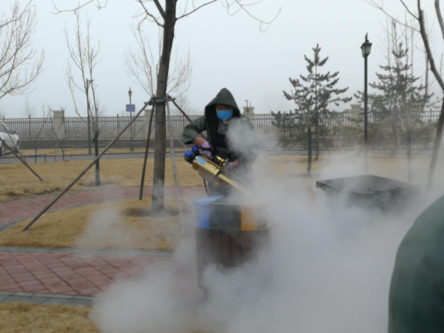 宋方兴老师作为顺义区蓝天救援队队员,每次参与志愿服务时,都需要全副武装,携带脉冲式弥雾机,图为和悦居小区各处进行全方位消毒。