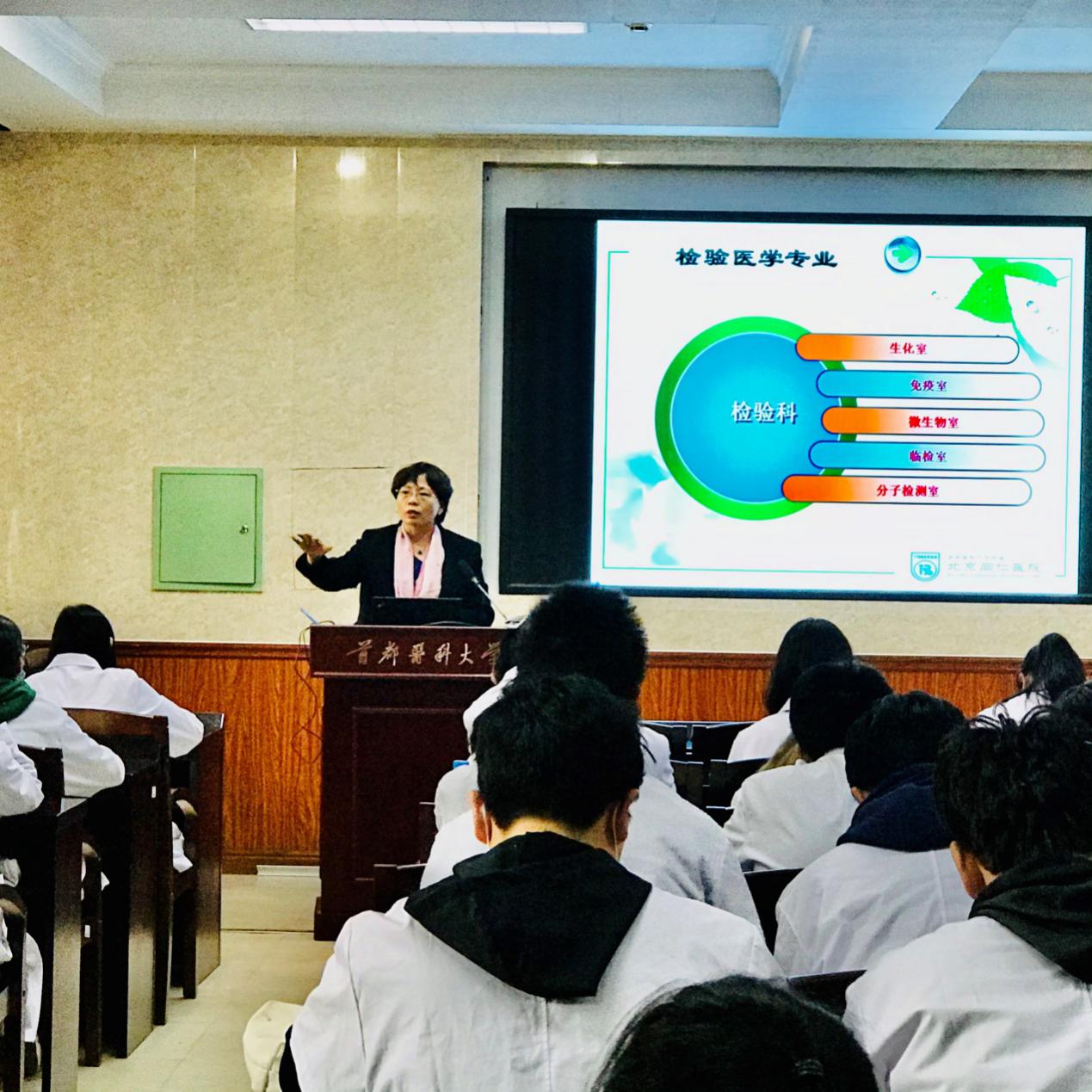 演讲前,刘主任亲切地与同学们进行交流,了解同学们选择学习医学检验技术专业的动机,针对同学们对检验的了解还不够全面的问题,详细介绍了医学检验是干什么的、医学检验教育的发展历程,以及检验科的概况、任务、工作流程等,使同学们更具体地了解了所学专业。随后,刘主任还深入地介绍了医学检验的广阔发展前景,她认为,在人工智能飞速进步的时代,检验也逐步变得愈来智能化,检验科的未来发展也必将充满机遇和挑战。她希望在座的每一位同学都要尽力做到“基础课程”、“临床课程”、“检验专业课程”、“实习科研”、“综合素质”共五个方面“五位一体”的要求和目标,并以自己的亲身经历教导同学们严格要求自己,每天进步一点点,让自己逐渐变得优秀、再优秀一点,全面提高自己的各方面素质,实现更高的自身价值,同时才能为社会做出更大的贡献。