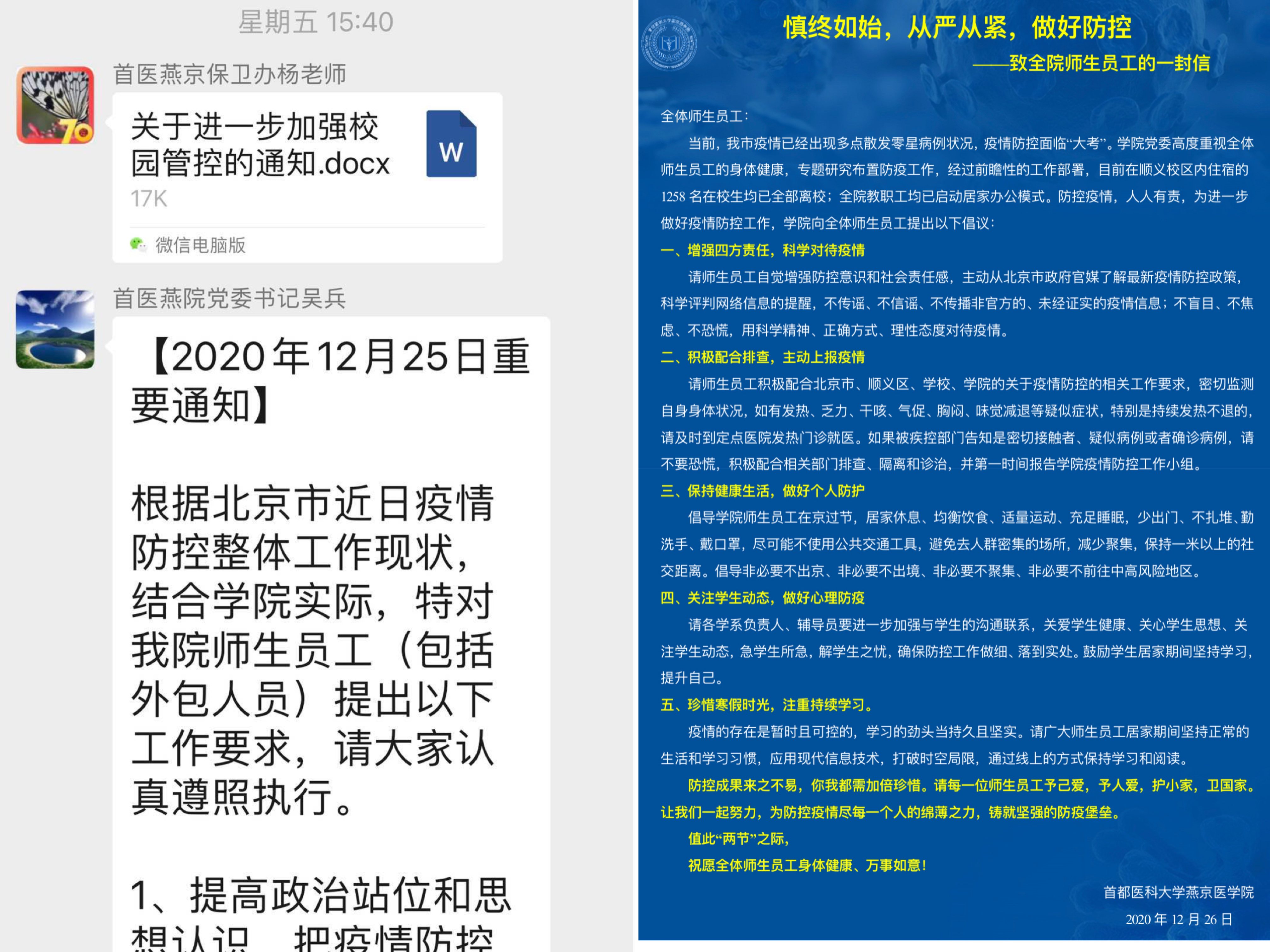 学校领导高度关注顺义区疫情情况,校党委书记呼文亮第一时间致电嗨皮漫画 ,了解嗨皮漫画 疫情防控相关工作,在肯定嗨皮漫画 工作的基础上,进一步提出了具体要求。嗨皮漫画 党委多次召开专题工作会,科学精准落实各项疫情防控工作。经过嗨皮漫画 党委前瞻性的工作部署,本学期伊始,嗨皮漫画 将教学工作调整为一周六天课,截至12月25日,除了2名西藏学生以外,本学期目前在顺义校区内住宿的1258名在校生均已全部离校,全院教职工均已启动居家办公模式。
