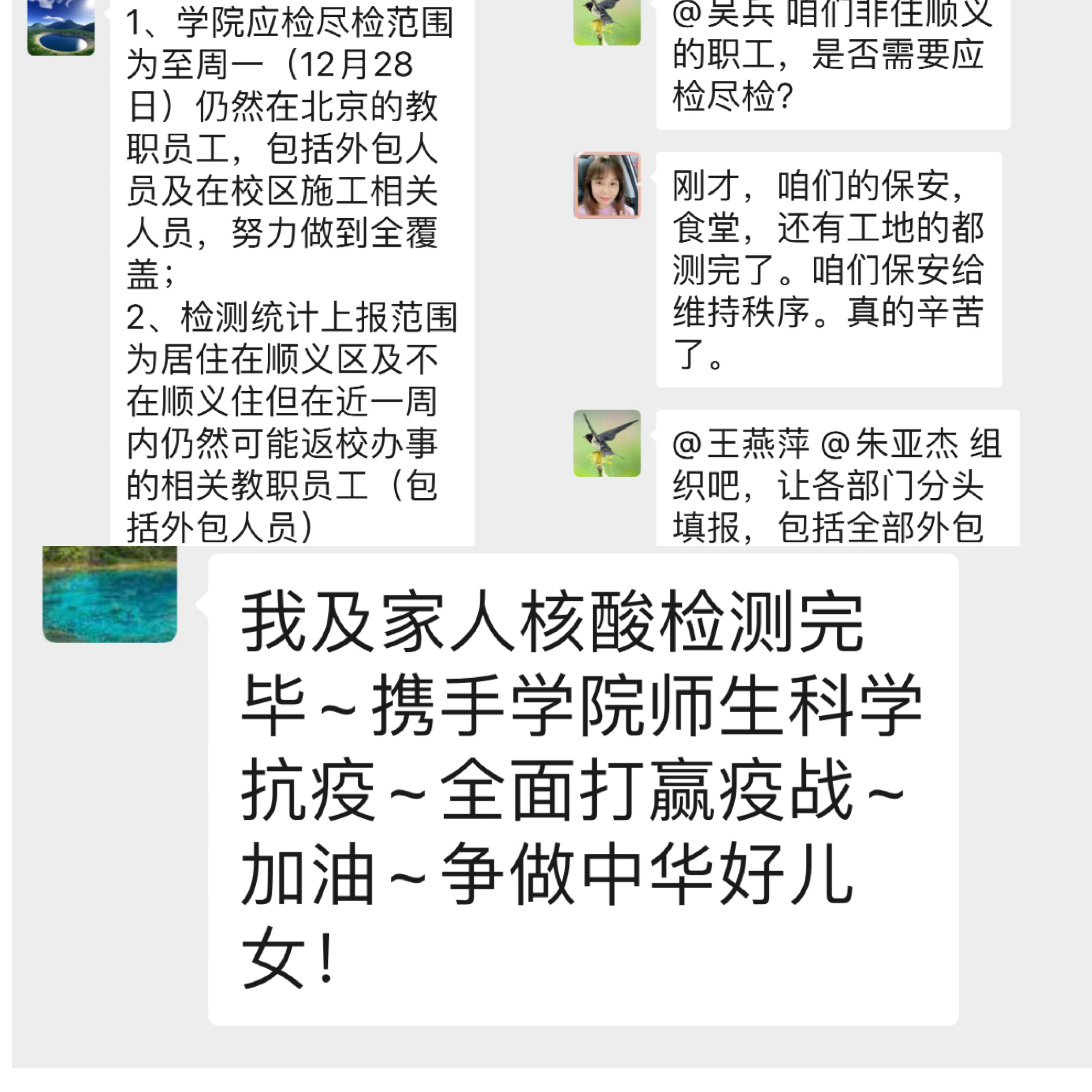 嗨皮漫画 通过多种新媒体渠道引导师生员工增强防护意识,科学佩戴口罩,做到勤洗手、常通风、与他人保持1米以上社交距离等卫生健康习惯;倡导教职员工在京过节,非必要不出京、非必要不出境、非必要不聚集、非必要不前往中高风险地区;切实做到不传谣、不信谣、不传播非官方的、未经证实的疫情信息,不盲目、不焦虑、不恐慌,用科学精神、正确方式、理性态度对待疫情。12月26日、27日嗨皮漫画 组织全院师生员工、保卫、保洁和餐饮人员进行核酸检测,嗨皮漫画 广大师生高度配合顺义区“应检尽检”的相关要求,及时通报个人检查进度,做好信息上报工作。