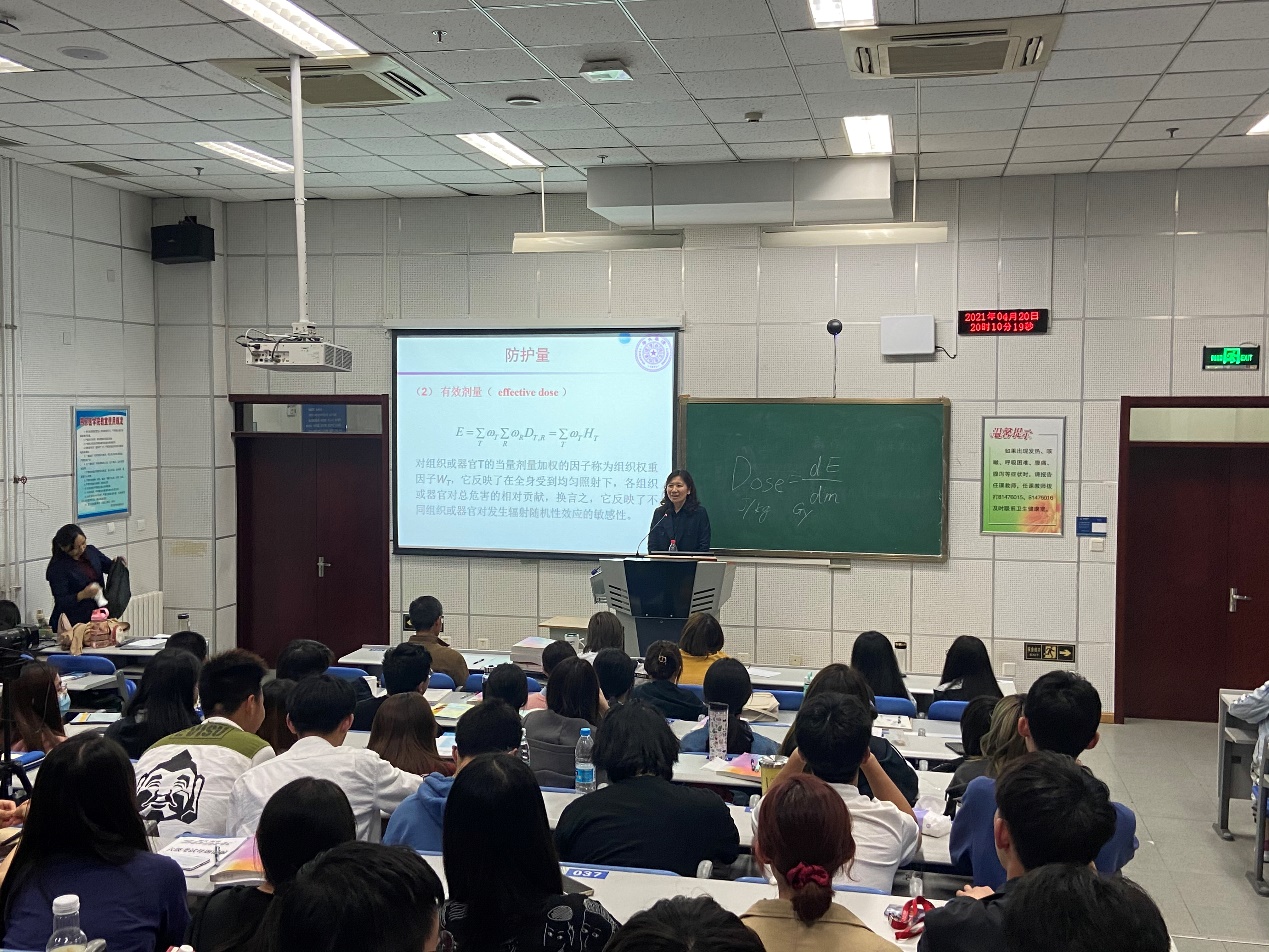 随后,邱睿教授还为同学们讲解了生活中的辐射来源、天然源以及人工源的年均剂量等,并深入介绍了自己在辐射剂量学方向的相关研究。对于医学影像技术专业的学生,邱睿教授还给出了一些关于放射防护课程的学习建议:同学们应当有综合性、发散性思维,将辐射防护知识融入到学科学习中,融会贯通。