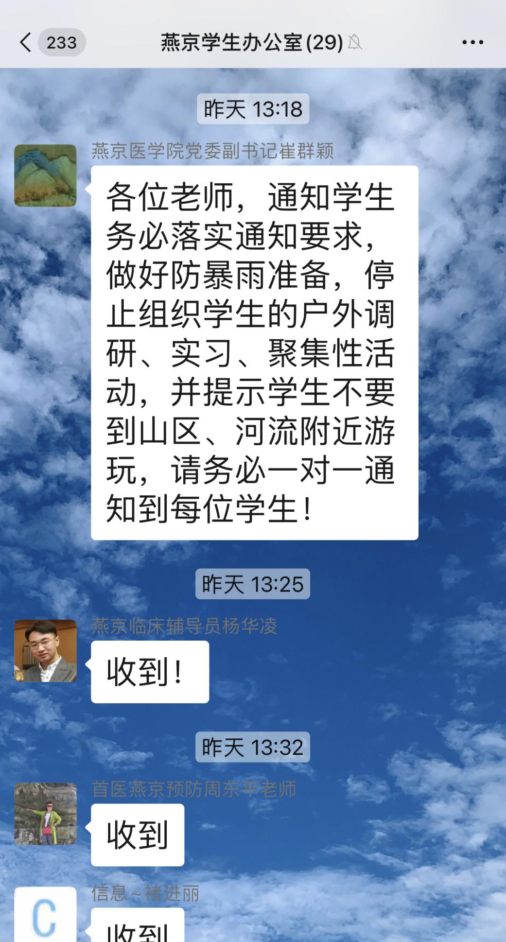 7月11日,嗨皮漫画 院长杨红第一时间在嗨皮漫画 中层工作群安排防汛相关工作要求,在职工工作群向全院师生发布汛情信息。