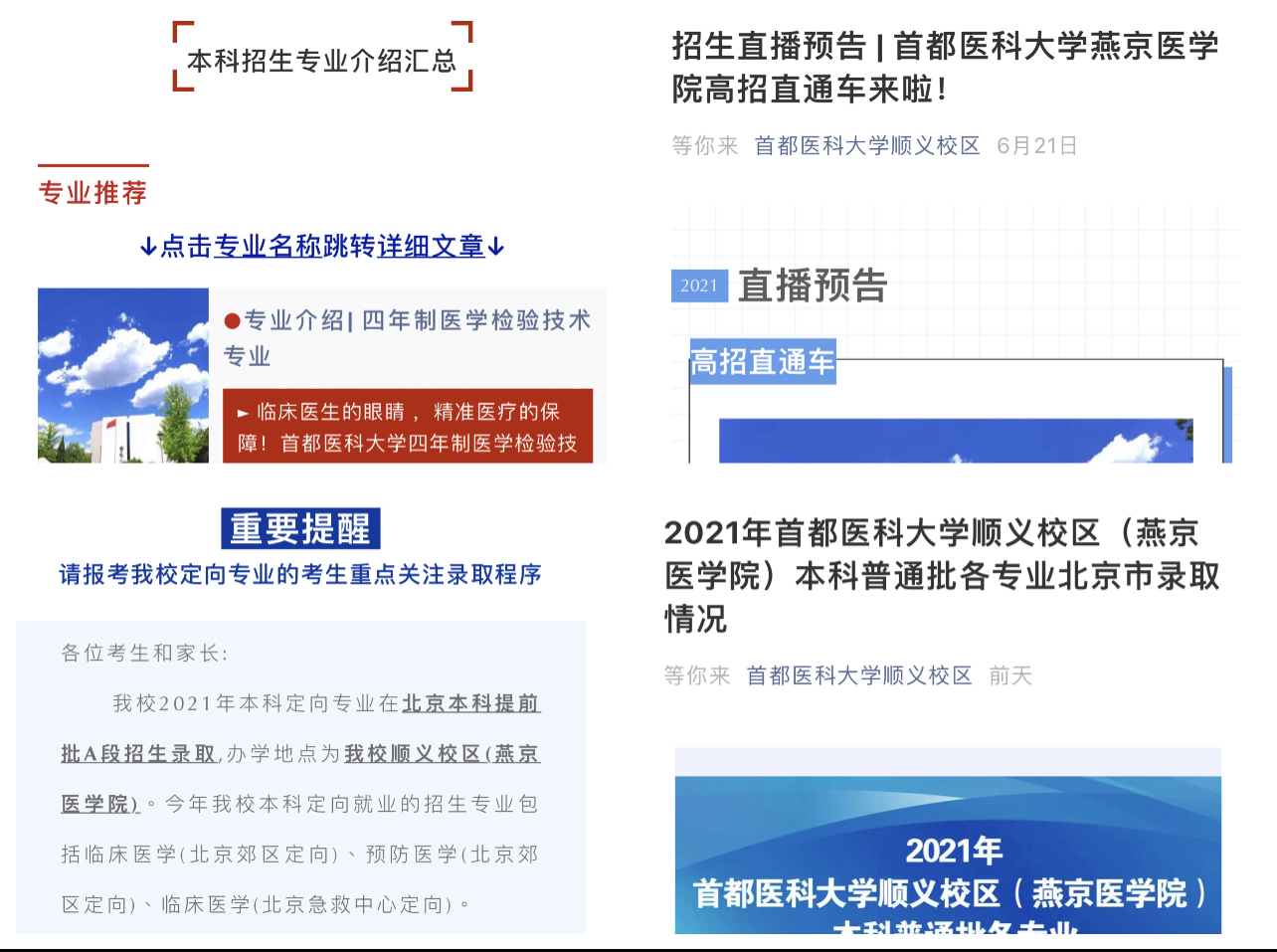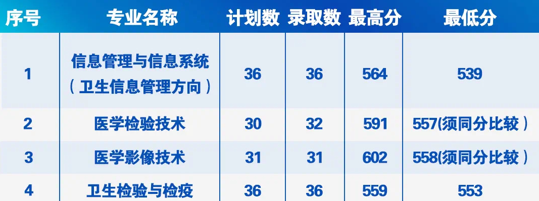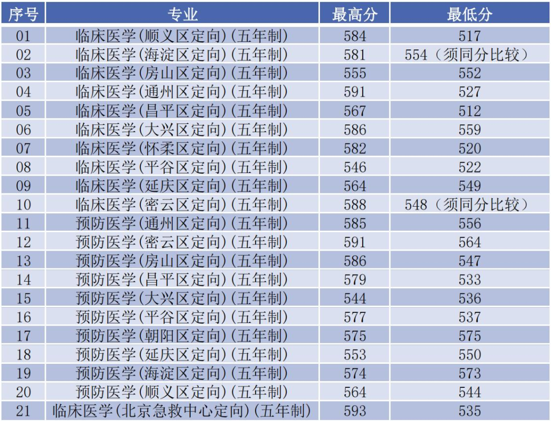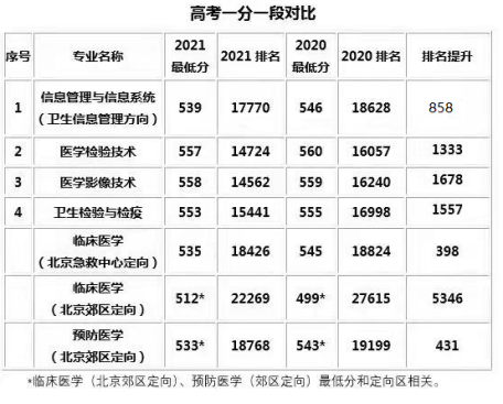 2021年本科提前批A段:五年制临床医学(北京郊区定向)专业录取数100人,最高分588分;五年制临床医学(北京急救中心定向)专业录取数30人,最高分593分;五年制预防医学(北京郊区定向)专业录取数40人,最高分591分。本科普通批:信息管理与信息系统(卫生信息管理方向)专业录取数36人,最高分564分;医学检验技术专业录取数32人,最高分 591分;医学影像技术专业录取数31人,最高分602分;卫生检验与检疫专业录取数36人,最高分559分。对比近几年招生情况,总体分数基本持平,综合排名稳步提升。