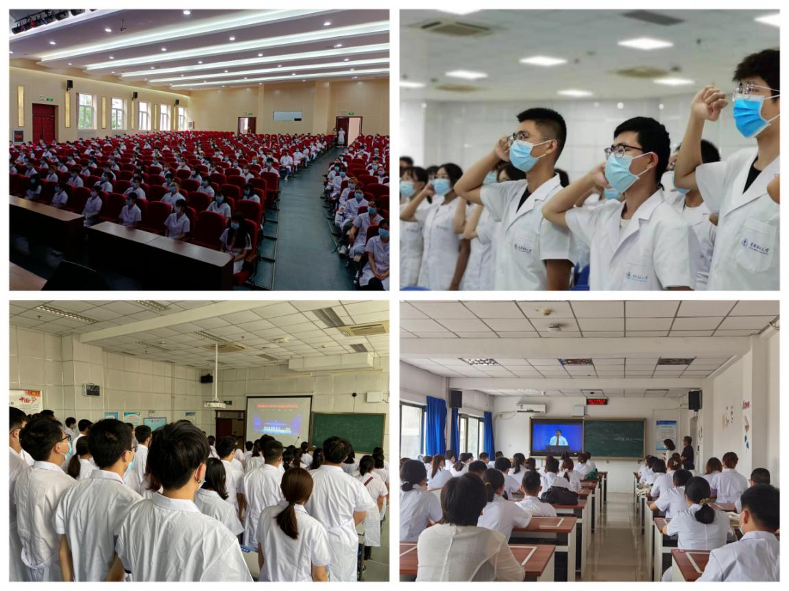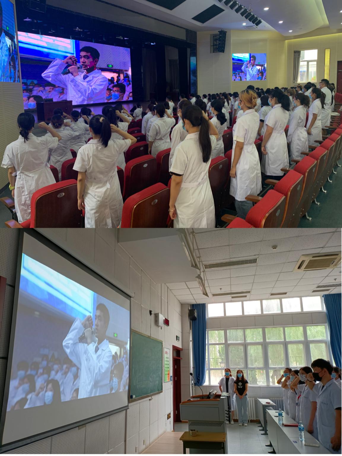 分会场的2021级新生身着白衣,高握右拳,与主会场同时庄严宣誓,洪亮且坚定的声音是在宣告他们要成为一名优秀医学生的信心和决心,要为祖国医药卫生事业的发展和人类身心健康奋斗终生的无悔和誓言。