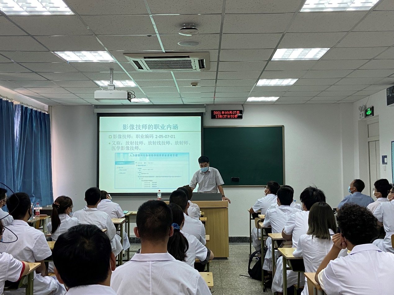 刘建新主任结合个人的工作经历从医学影像技术的职业内涵、专业在医院的重要性、医学影像设备的多样性等几个方面为同学们展开讲解。课堂上,他为同学们介绍了多种实用的学习方法,建议同学们要多读书,做好知识储备,重视系统性学习并学以致用,重视实践,还耐心解答了同学们提出的各种问题。