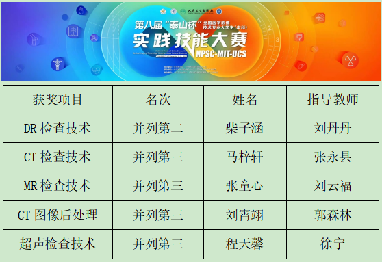 在刚刚落幕的第八届“泰山杯”全国医学影像技术专业大学生(本科)实践技能大赛中,我院四年制医学影像技术代表队顽强拼搏,凭借良好的职业技能和团队精神,首次参赛便荣获大赛团体奖并列第三,柴子涵获得个人单项奖并列第二,马梓轩、张童心、刘霄翊、程天馨分获个人单项奖并列第三。在同期举办的第四届全国医学影像技术专业青年教师微课教学大赛中,附属同仁医院放射科、四年制医学影像技术专业临床兼任教师刘丹丹荣获并列第三。
