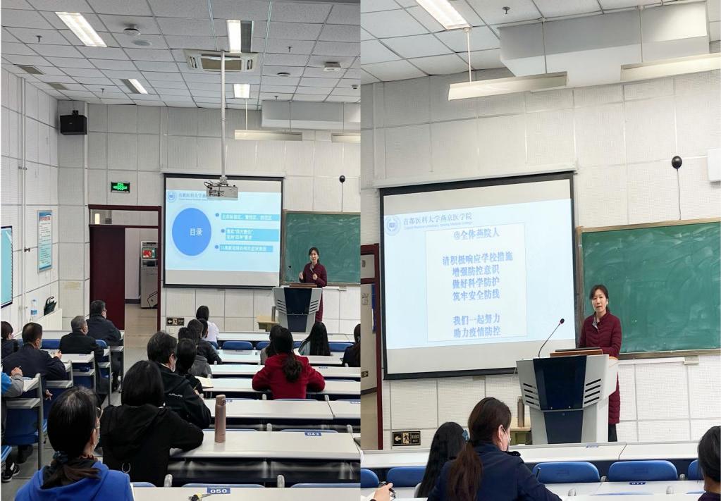 杨红院长传达北京市、学校疫情防控工作会议精神,对当前做好嗨皮漫画 疫情防控工作提出了具体要求。一是倡导教职员工在疫情防控期间,实行“两点一线”上下班模式;倡导学生近期非必要不离京、不出顺、不离校,严格审批出校申请。二是落实校门管理要求,对来访人员进行体温检测、核验健康码、行程码并做好登记。三是继续坚持对教学场所、图书馆、食堂等公共区域进行日常环境消杀及通风,并及时落实详细记录。四是引导师生员工主动参与疫苗接种工作,嗨皮漫画 已于10月24号完成统一组织教职员工(第一批)接种疫苗第三针工作,拟于近期组织学生接种疫苗第三针专场;五是全体师生员工要积极做好个人防护,进入教学楼、教室等密闭空间必须严格科学佩戴口罩,保持安全社交距离。六、及时关注疫情对在校师生和退休老同志心理情绪的影响,建立心理疏导机制,由专人负责,统一协调。
