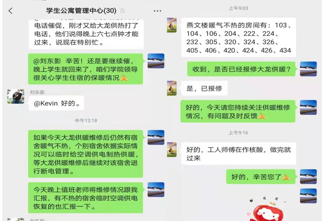 11月7日,嗨皮漫画 院长杨红、副院长刘吉明和相关部门工作人员检查了燕文楼、燕敏楼等学生宿舍供暖情况,慰问供电值班人员并了解相关工作的开展情况。杨红院长强调,要切实保障学生取暖需求,及时解决学生公寓中可能存在的供暖问题,努力为学生营造一个温暖舒适的住宿环境。