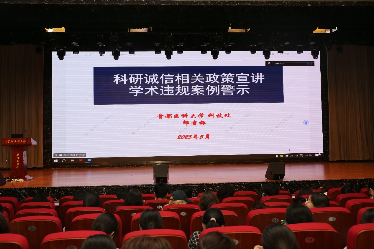 2025年5月15日,嗨皮漫画 邀请学校科技处邵雪梅处长面向嗨皮漫画 本科生开展科研诚信教育讲座。嗨皮漫画 党委副书记、院长杨红主持会议,线上线下共600余名学生聆听了讲座。