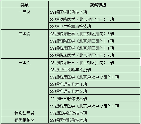 经过教师评委和学生评委的共同评选,最终,2023级医学影像技术专业等14个班级在角逐中胜出,分获一、二、三等奖和特别创新奖、优秀组织奖。