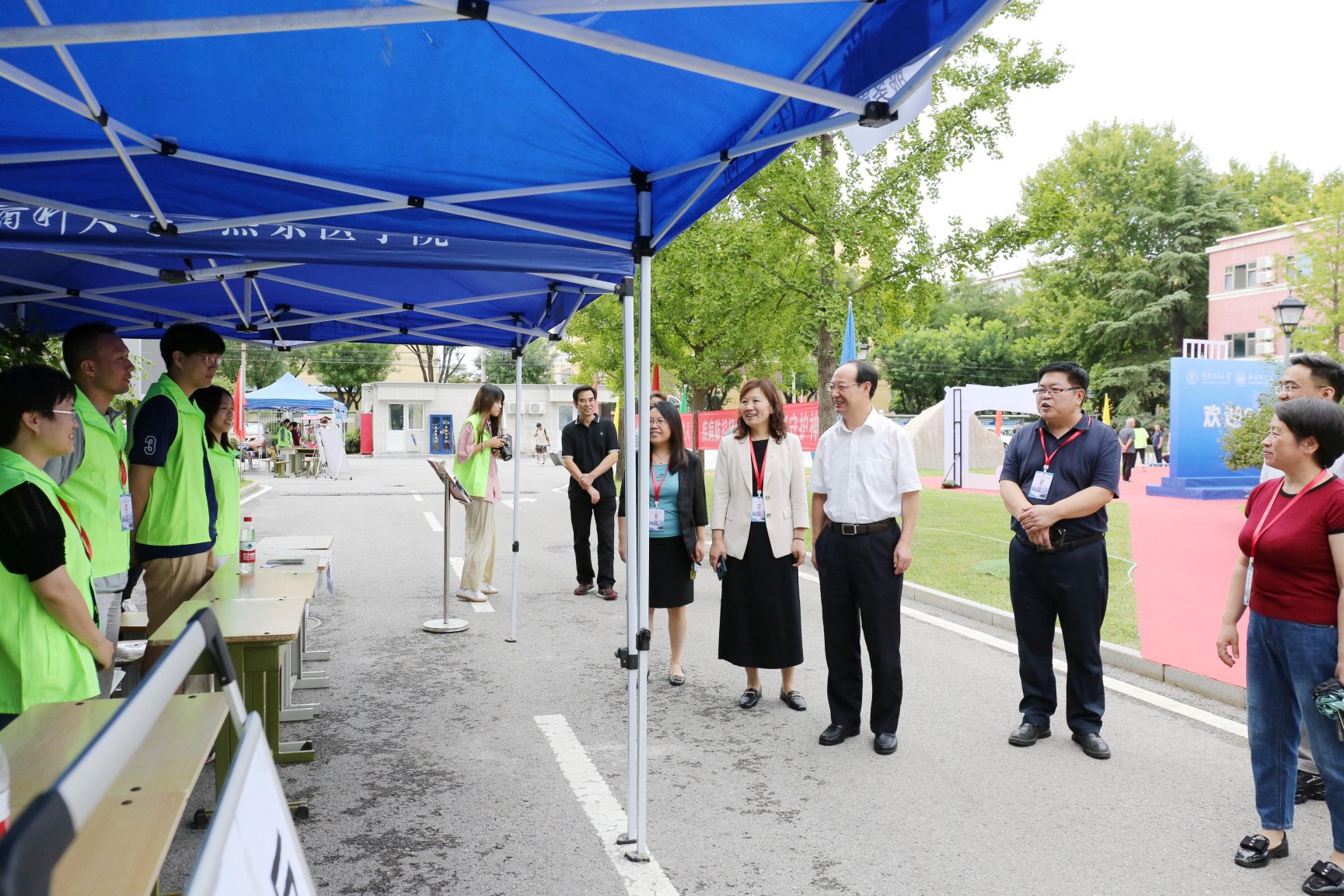 呼文亮书记走访各学系迎新点,详细了解新生最新报到人数和迎新流程。