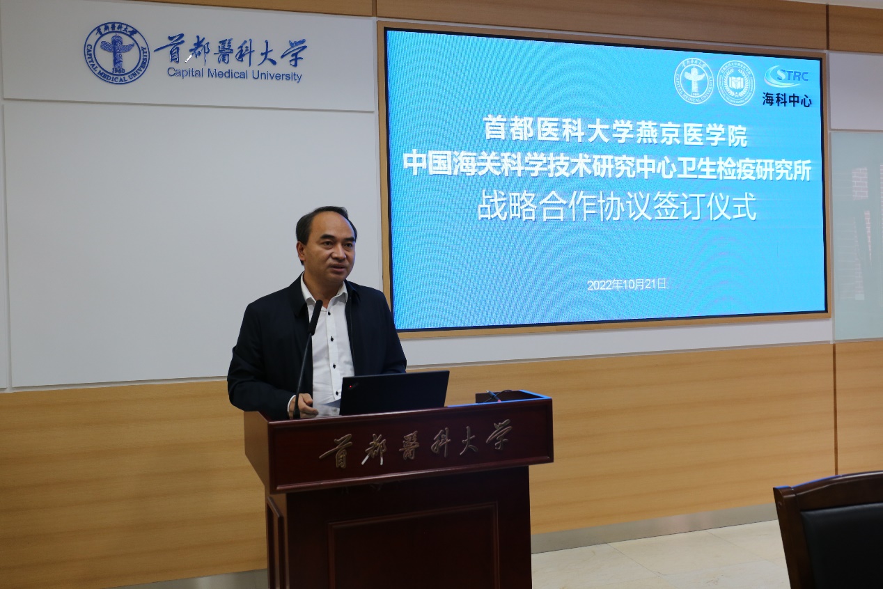 中国海关科学技术研究中心宋悦谦主任介绍了海科中心的发展历程以及卫生检疫研究所担负的使命与职责,表示对双方的合作充满信心,希望与我院共同培养更多人才。