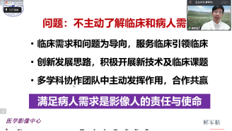 导论课上,鲜军舫老师从机械智能化出发,阐述了AI与影像医师的关系。AI将是智能工具与得力助手,影像医师要以患者和临床问题为导向,与经验有机结合判读病例,确定机器的判断是否正确,影像医生要积极主动地面对人工智能,人工智能能取代的只是“读片”的医生,而非影像医生。