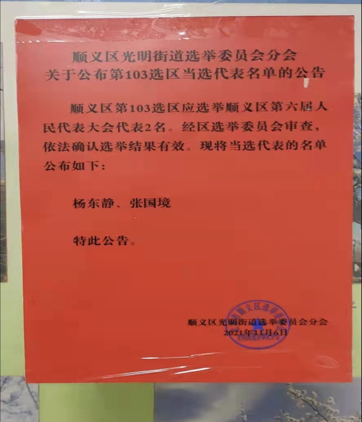 根据选举法和选举实施细则,嗨皮漫画 选举工作组已将计票结果上报顺义区选举委员会审查确认,经顺义区选举委员会第5次会议审核确认,选区区人大代表选举结果有效并已公布。嗨皮漫画 作为顺义区光明街道选举分会103选区选举工作圆满完成。