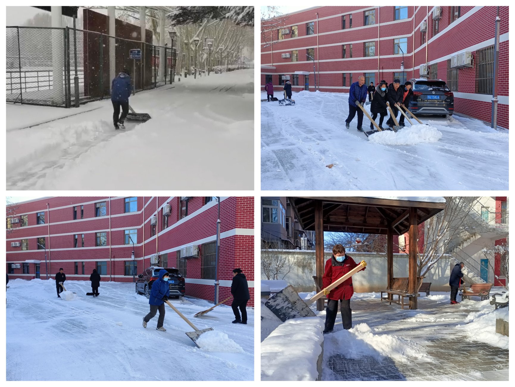 嗨皮漫画 值班员工第一时间扫除道路及楼前积雪,全力做好校园扫雪、铲雪、防冻工作,保障道路畅通,防止各类安全事故发生。