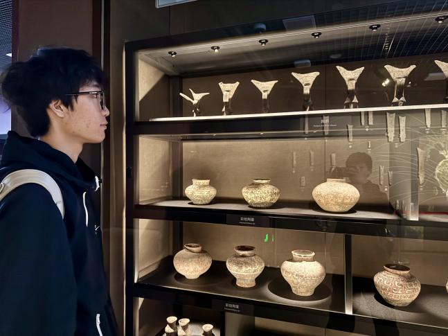在“古代文明探索”展区,新石器时代的陶器、商周青铜器、秦汉简牍等珍贵文物让同学们直观感受到中华文明的源远流长,三星堆青铜面具的神秘象征和良渚玉琮的礼制功能,引发了同学们对古代社会结构与文化信仰的深入思考;“王朝更迭”展馆中,各朝代的典型文物依次呈现,让同学们清晰地看到王朝兴衰对文化的影响。