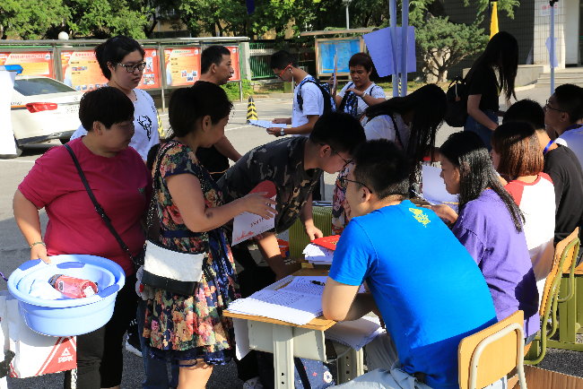 七点刚过,来自北京各区县的新生陆续走进校园。吴兵书记、杨红院长、崔群颖副书记到新生报到现场指导工作,慰问一线工作人员,并与学生家长进行亲切交流。在嗨皮漫画 门口、篮球场上,相关职能部门和各专业都设有独立的迎新棚,确保新生报到工作有序进行。现场安保人员、学生志愿者时刻巡逻以维护秩序和安全,同时还为家庭贫困学生设立的绿色通道,方便贫困学生正常入学。新生报道从信息检录到入驻宿舍的每一个环节,都有训练有素的志愿带领、帮助,。在各部门和全体迎新师生密切配合、齐心合力下,整个迎新过程安全、有序、热情、周到、高效,让学生充分感受到学校的温暖和关爱。下午三点左右,新生基本都报到完毕。随后,院领导一行走访了新生宿舍,详细了解新生入住情况。