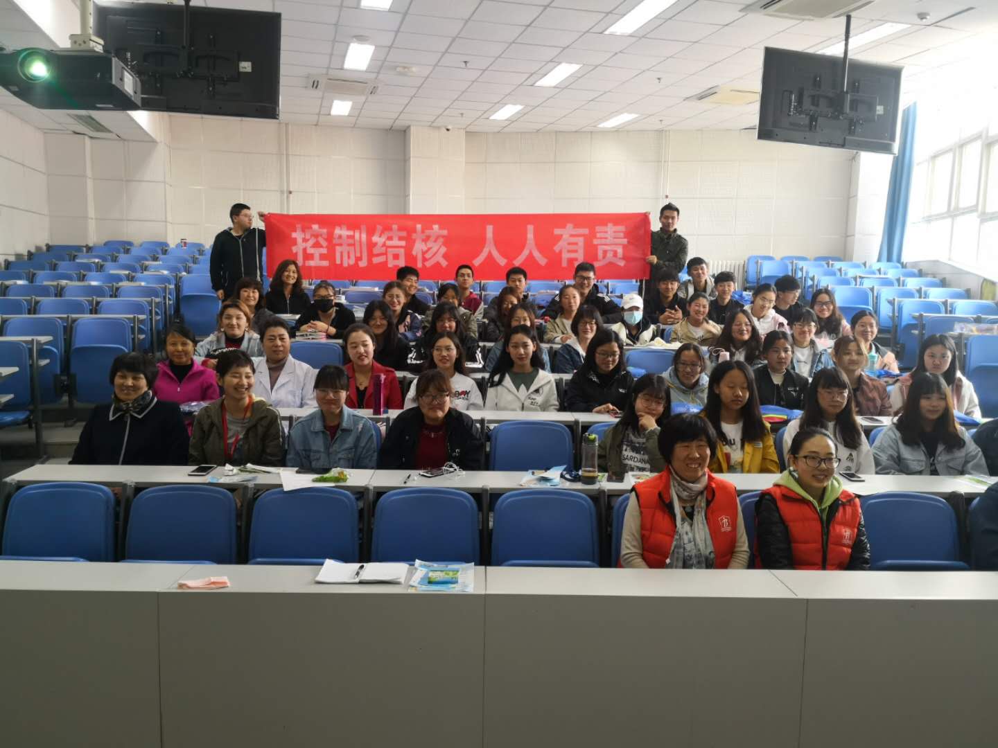 王老师从事结核病的防治工作多年,具有丰富的临床经验。她首先介绍了全球结核病的现状,大家了解到我国为结核病第二大国,仅次于印度,是世界上结核病疫情负担最重的国家之一。结核病的疫情呈现感染率高、肺结核患病率高、死亡人数多的特点。随后她又详细深入地讲解了肺结核病的概念、成因、危害、传播途径、患病人群及预防措施。她讲到对肺结核病来说防治是一个需要高度重视的公共卫生问题。最后针对同学们所处的年龄段容易产生的困惑,讲解了结核病一些常见的发病时期、发病症状及相关疫苗知识,同学们边听边记,非常认真。