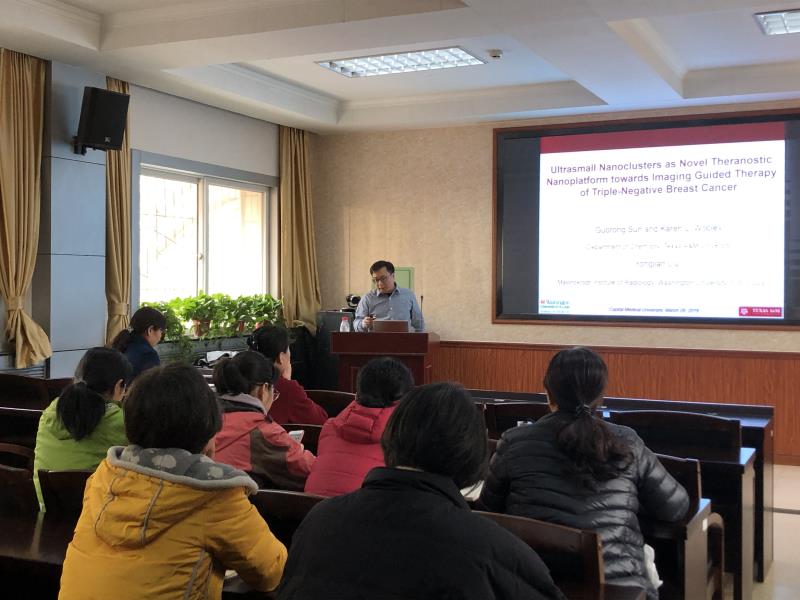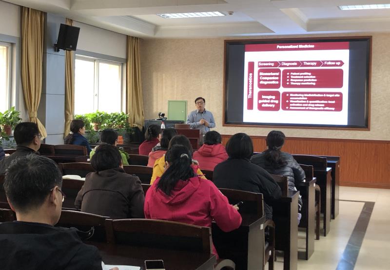 孙国荣研究员重点介绍了所在团队在影像引导治疗方面取得的进展,他们开发了CXCR-靶向NCs(超小型纳米团簇)作为新型诊疗纳米平台,并取得了令人满意的效果。报告为大家详细描述了该项新技术设计和合成的方法、取得的结果。随后,孙研究员和在场老师们进行了简短、热烈的学术交流,耐心并详细解答了老师们提出的问题。讲座结束后,杨红院长对孙研究员的报告表示了感谢,并对讲座进行了总结,同时介绍了国自然申报中与纳米技术相关的研究领域,对老师们积极开展科研工作表示了肯定。