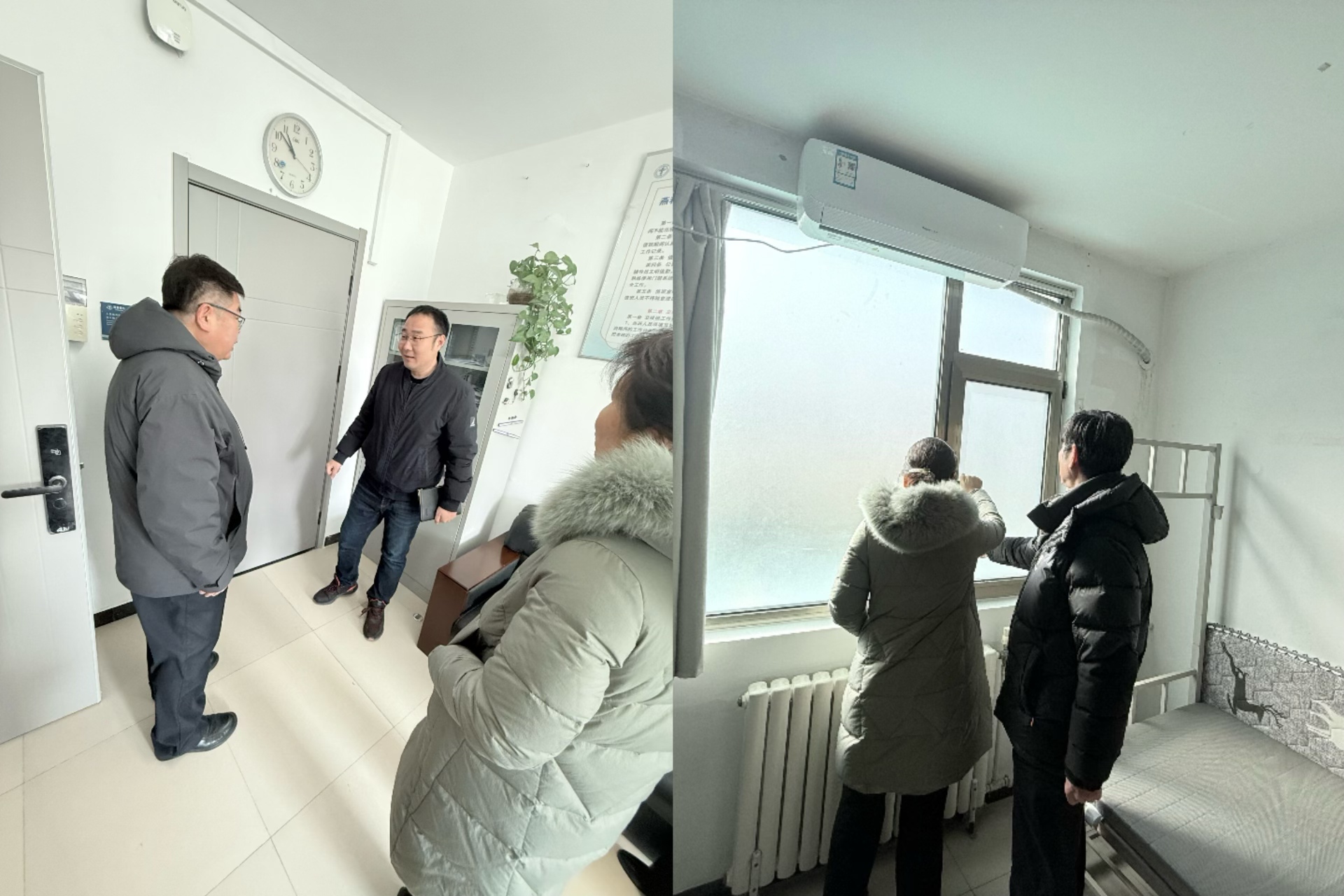 嗨皮漫画 领导到学生宿舍检查假期门窗修缮改造情况,询问了解学生当前返校情况。