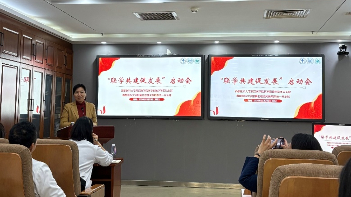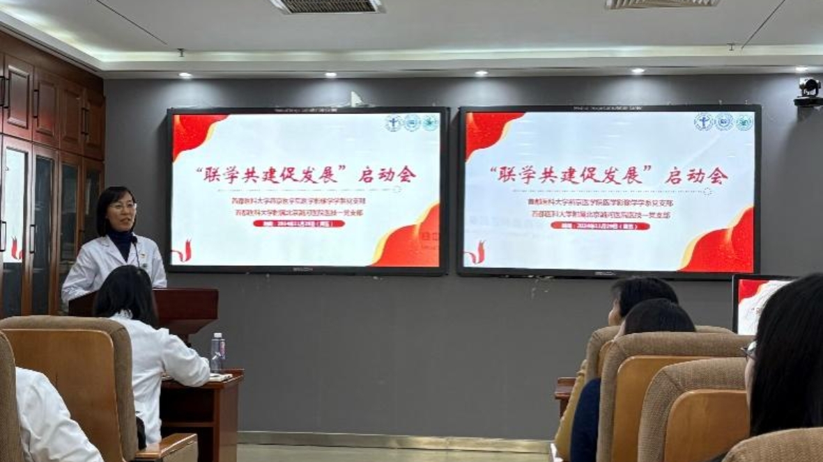 会上,全俊亚致辞,她强调了党建与业务同频共振、融合发展的重要性,希望通过此次联学共建活动,推动双方党支部在理念、载体、措施上的交流与合作,更好地发挥党建引领的作用。随后,杨红在讲话中指出,此次活动的核心是高质量党建促进高质量发展,医学影像技术专业的发展强调基础和临床协同育人,希望以联学共建促进双方的协同创新。赵京红回顾了双方合作办学的成功经验,并表示将继续全力支持双方的合作。