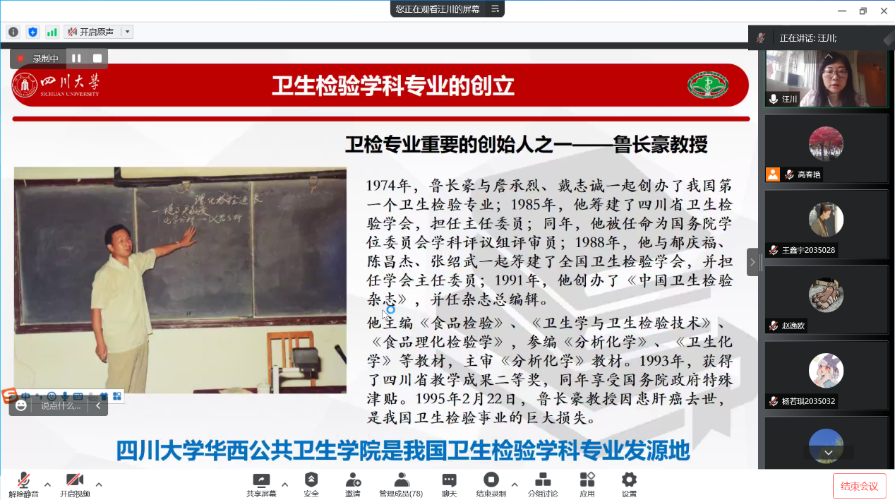 讲座中,汪川教授首先从什么是预防医学、什么是卫生检验入题,为大家介绍了卫生检验与检疫专业的诞生和发展史,指出卫生检验在卫生应急事件处理和预测重大疾病的发生中的重要作用,尤其是在当前疫情环境更是起着不可或缺的作用。