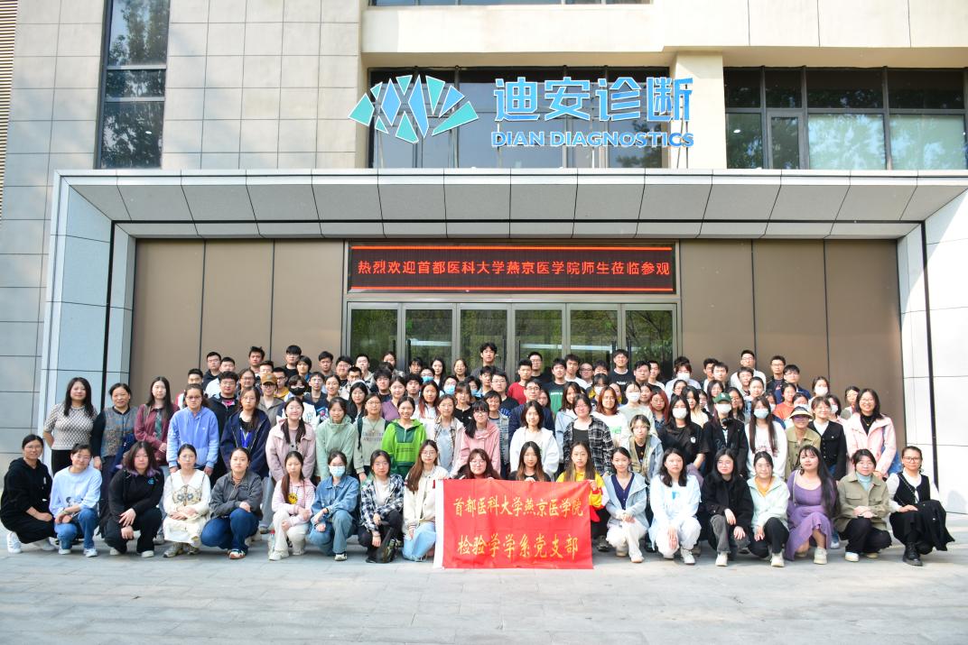 4月12日下午,检验学学系党支部书记孙宁带领2021、2022级四年制卫生检验与检疫本科班和2022级四年制医学检验本科班共110名学生赴大兴生物医药基地参观北京迪安诊断技术集团股份有限公司(以下简称“迪安集团”)。