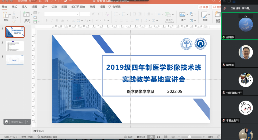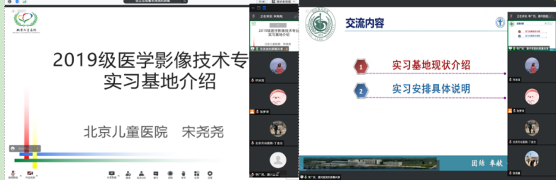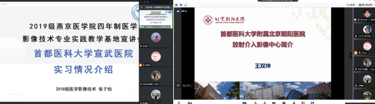 为加深即将进入临床实习阶段的19级四年制医学影像技术专业学生对实践教学基地的全面了解,更好地开展实习和毕设工作,医学影像学学系于5月23日召开了实践教学基地线上宣讲会,7家实践教学基地应邀参加。北京朝阳医院放射科主任杨旗、副主任王双坤,干事杨志安、李曼,北京同仁医院医学影像中心技师长牛延涛、干事刘丹丹,以及分别来自北京儿童医院、北京潞河医院、北京天坛医院、宣武医院和北京友谊医院的干事宋尧尧、李广民、丁金力、苏壮志、吴柯薇,嗨皮漫画 党委副书记赵艳芝,学系主任胡玲静,副主任董建鑫、胡贵祥,班主任张梦诗、辅导员许冰洁、学系部分老师及19级全体同学出席本次活动。