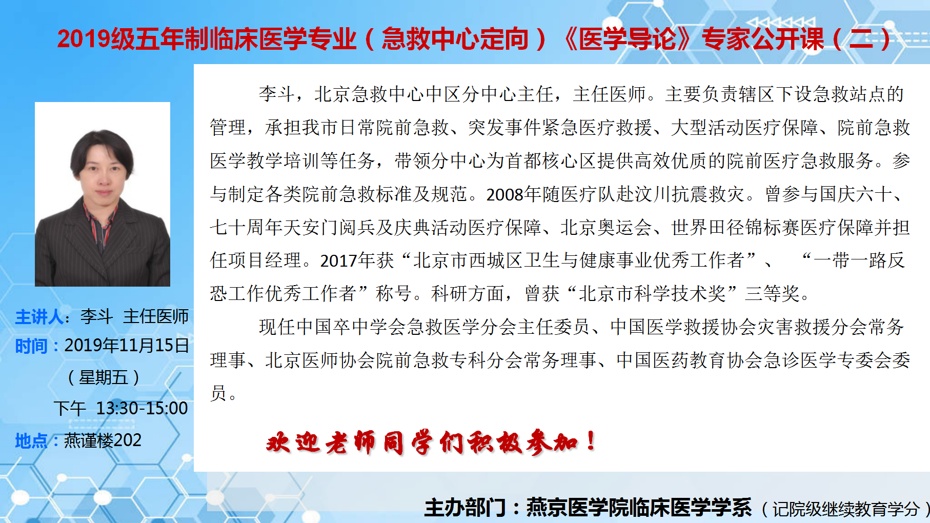 李斗主任《医学导论》专家公开课(二)的通知