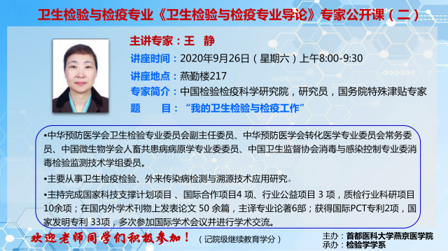 王静研究员"卫生检验与检疫专业导论"专家公开课的通知