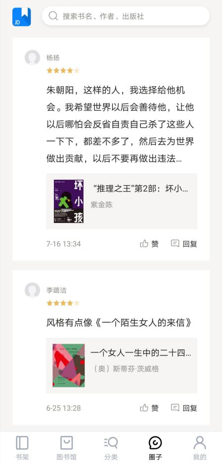 一本书读完后,点击“写评论”即可发表书评,所有书评可在“圈子”页面查看和参与互动留言、点赞。