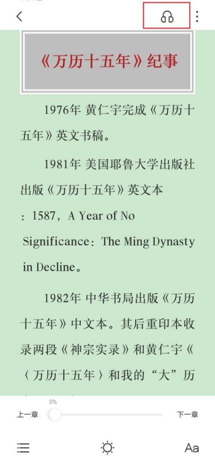 看书时轻点屏幕中央,点击右上角的“耳机”即可听书,推荐使用 实验室版 普通男声/普通女声,该页面也可设置语速、时间。